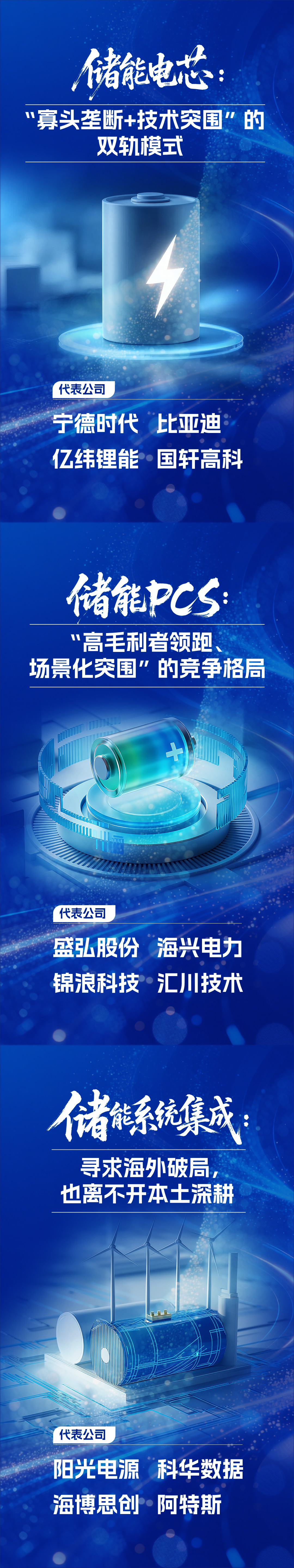 来源:上海证券报·中国证券网线上配资股票平台 当AI数据中心的耗电量急剧攀升, 全球新能源渗透率持续增长, 储能稳定能源供应的核心价值凸显, 2026年的储能产业机会有多大? 一起跟随机构视点剖析产业链各环节价值↓ ![]() 政策之机 国家发展改革委、国家能源局近日发布《关于促进新能源消纳和调控的指导意见》,其中多处提及储能相关建设与发展要求,指出要大力推进技术先进、安全高效的新型储能建设,挖掘新能源配建储能调节潜力,提升利用水平。 《中共中央关于制定国民经济和社会发展第十五个五年规划的建议》提出,大力发展新型储能。 新增长级 ![]() 爱建证券:2024年发布的《数据中心绿色低碳发展专项行动计划》提出,国家枢纽节点新建数据中心绿电占比超过 80%的目标。考虑配储功率为 1:1 及配储时长在3-4 小时之间,预计每 100MW 的数据中心建设有望带动 450-800MWh 的储能需求。 中信证券:美国制造业回流及AIDC批量并网带来电力紧缺,放大美国电网扩容诉求,OBBB法案通过抢装加速储能需求释放,Nvidia明确AIDC配储方案打开长期天花板。中国储能厂商有望凭借丰富的项目经验、显著的性价比优势和供应链保障能力,强化全球份额优势和龙头话语权,推动业绩持续高增。 需求共振 ![]() 中金公司: 储能受益于国内盈利拐点及海外增高景气。在明确储能作为独立市场主体参与市场交易、136号文取消强制配储及市场化交易扩大峰谷价差、完善储能容量电价机制等政策陆续推出后,国内独立储能系统经济性迎来拐点。叠加欧洲/澳洲等非美市场随着电芯降价实现储能平价、美国市场因OBBB法案抢装及AI电力需求/数据中心配储等需求高景气,总体推动储能需求高速增长,带动储能系统集成商、PCS企业、电芯厂等的投资机会。 估值优势 ![]() 汇丰晋信基金:储能行业前两年伴随新能源板块整体的调整,持续呈现下跌态势。今年以来,受到年初136号文、美国关税的影响,叠加市场对于行业未来业绩的担忧,目前储能行业估值一定程度上受到压制,多家龙头企业2026年估值均位于20倍上下。随着前述两个增长点被持续验证,未来市场可能会逐步修正对于储能行业的估值,从而有望为行业带来估值和盈利上修的双击时刻。 中信证券:国产储能产业链具备明显优势,电芯、储能系统环节全球份额持续提升,建议关注布局海外储能产业链的头部厂商,看好储能系统集成商、电芯供应商及PCS供应商。 产业链三大核心赛道 ![]() ![]() 》》储能电芯:“寡头垄断+技术突围”的双轨模式 宁德时代:2025年前三季度实现营业收入2830亿元,储能电芯业务营收占总营收比重达25%,同比增长60%以上。前三季度宁德时代储能电芯累计出货量达90GWh,占全球市场份额24.2%,海外订单占比62%。其587Ah大电芯量产占储能出货量超30%,带动储能业务毛利率提升。 比亚迪:北美户用储能市场表现亮眼,市占率达51%。 亿纬锂能(维权):前三季度储能电芯出货量48.4GWh,全球市占率11.6%。全球首款量产的628Ah储能电芯能量密度达210Wh/kg,已应用于湖北荆门400MWh独立储能电站,推动系统全生命周期成本降低8%。 国轩高科:三季度电芯赛道最大“黑马”:第三季度单季营收101.14亿元,同比增长20.68%,创历史同期最高纪录。核心驱动力来自海外市场突破与液冷技术落地:储能电芯出货量约19GWh。 》》储能PCS:“高毛利者领跑、场景化突围”的竞争格局 盛弘股份:前三季度毛利率达39.92%,属第一梯队。核心优势在于能源管理系统的技术壁垒,其PCS产品与充电桩业务形成场景互补。在工商业储能领域市占率稳居前十。 海兴电力:前三季度毛利率39.89%,属第一梯队。聚焦高端市场,EMS系统在欧洲工业储能项目中的中标率达28%。 锦浪科技:户用储能PCS领域保持领先。产品溢价较行业平均水平高15%-20%,成为盈利核心支撑。 汇川技术:绝对规模优势领跑行业。采用“PCS+储能系统+能源服务”全产业链布局。 》》储能系统集成:寻求海外破局,也离不开本土深耕 阳光电源:前三季度储能业务收入288亿元,同比增长105%,海外发货占比高达83%。在欧洲工商储市场拿下多个百兆瓦级项目。公司表示:年初制定的发货量(非订单量)目标为40吉瓦时至50吉瓦时,目前对完成目标保持信心。 科华数据:聚焦细分场景突围,数据中心储能订单占比储能业务达45%,增速45%。凭借液冷技术领先优势,成为国内三大云计算厂商的核心储能供应商。数据中心储能系统市占率超20%。 海博思创:主要聚焦电网侧与工商业储能市场。前三季度海外订单同比激增500%。海博思创近期与宁德时代签署战略协议,锁定2026年至2028年期间采购电量累计不低于200GWh。另外,公司还签署了菲律宾185MWh大型储能项目。 阿特斯:二季度储能出货2.2GWh,环比一季度增长超140%。公司全球累计交付量已突破13GWh大关。公司近期确认已签署加拿大“天望2号 (Skyview 2)”项目合同,将为其提供全套储能解决方案及交钥匙EPC服务。该项目为加拿大安大略省迄今规模最大的储能项目之一,项目规模411MW/1,858MWh。 文案:王宙洁 姚嘉雯 王远 设计制作:范雨露 赵旭 统筹策划:全泽源 浦泓毅 衡道庆 上海证券报融媒体中心出品线上配资股票平台